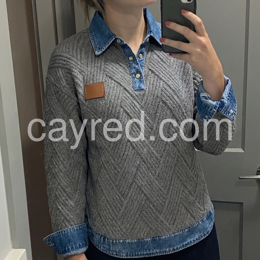 Elevate your casual wardrobe with this sophisticated grey herringbone knit sweater, featuring a distinctive denim collar that bridges the gap between refined knitwear and relaxed styling. The herringbone texture adds visual depth and dimension, while the contrasting denim collar provides a contemporary edge perfect for layering or wearing standalone. Crafted for versatility, this piece transitions seamlessly from weekend wear to smart-casual settings, offering both comfort and polished appeal.