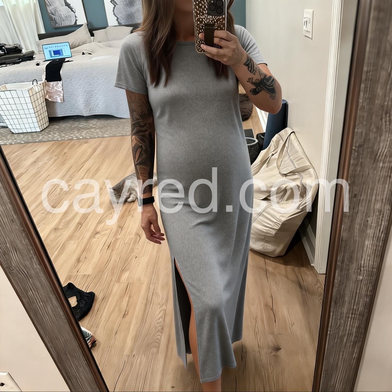A jersey knit T-shirt dress is always your answer to weekend dressing. The easy style has a rounded split hem that you can wear long and loose or tie in the front and a comfy hand pocket. Pull it off the shoulder for an asymmetrical effect. We like wearing the dress on shopping trips and spa days with sunglasses and sandals.