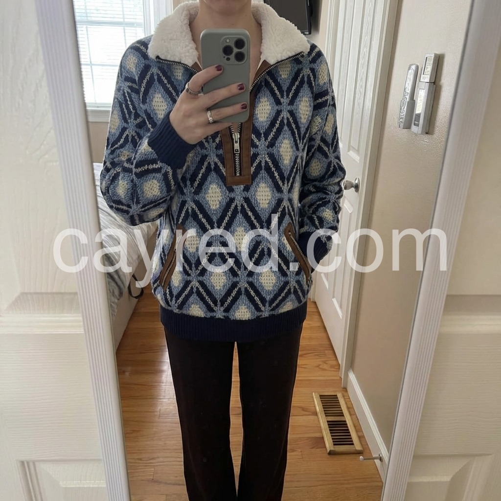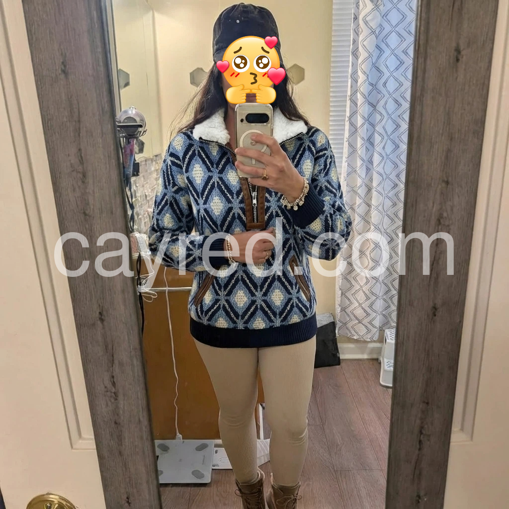 Elevate your cold-weather wardrobe with this sophisticated knit sweater, featuring a striking blue geometric pattern that adds visual interest to any ensemble. The fleece lining provides exceptional warmth and comfort, making it an ideal choice for layering or standalone wear during transitional seasons. Crafted from quality knit fabric, this piece combines contemporary design with practical functionality. The geometric detailing brings modern flair while maintaining versatility—pair it effortlessly with jeans, trousers, or skirts for polished everyday styling.