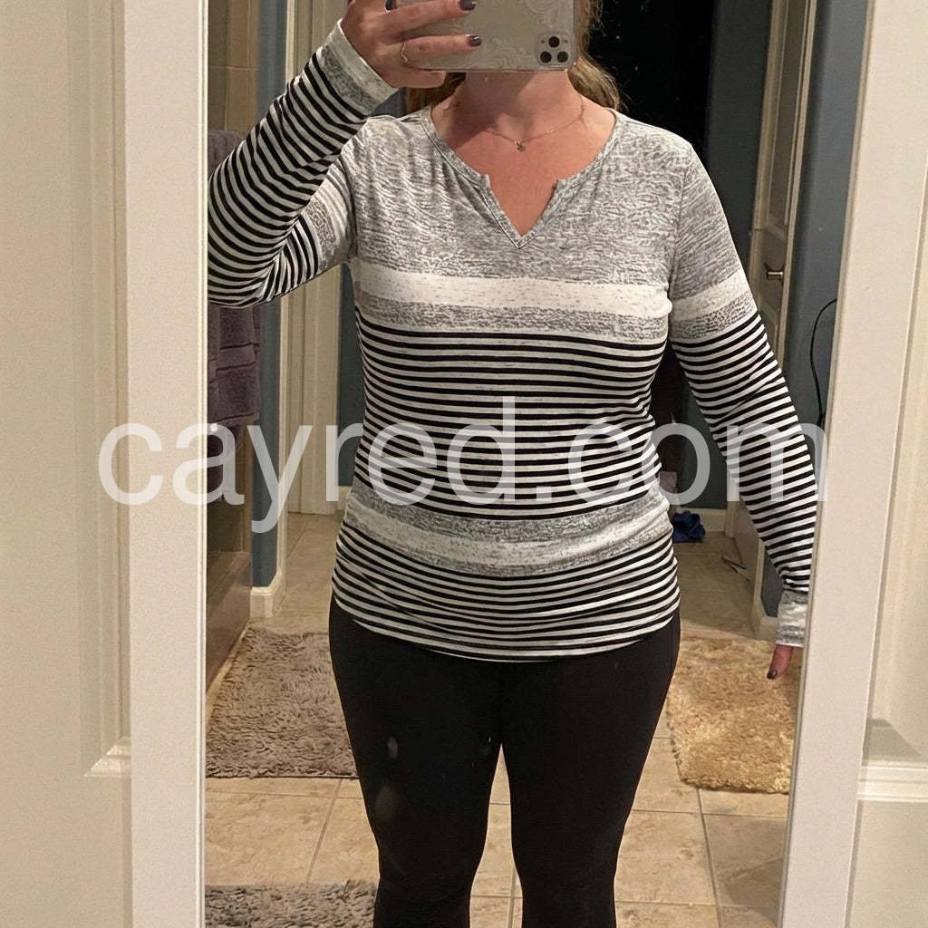 Youthful Notched Neck Striped Print Long Sleeve Top